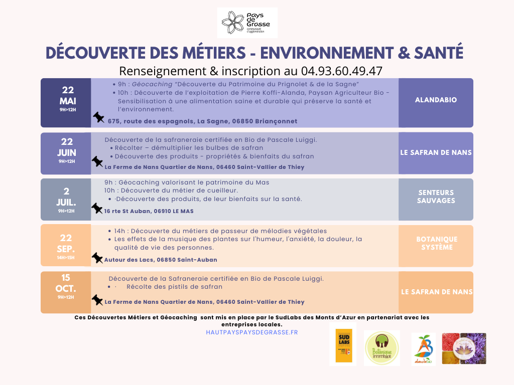 Vous souhaitez découvrir l'économie locale* du Haut-Pays Grassois. Des sorties « découvertes des métiers » sont organisées et ouvertes à tout public tout au long de l'année. Certaines intègrent des géocachings valorisant le patrimoine de nos communes.